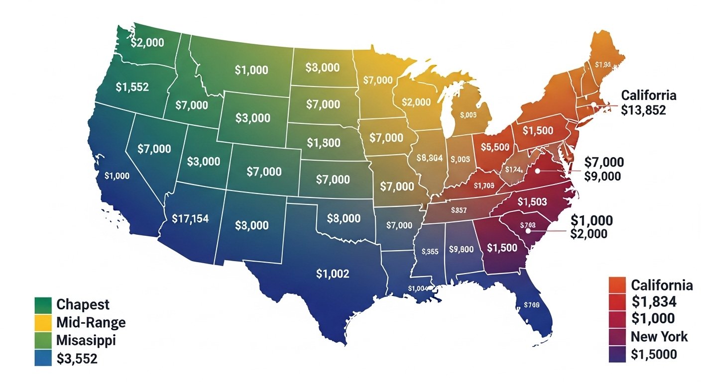 Geographic Pattern: All ten cheapest states cluster in the South and Midwest regions. Not a single coastal state appears in this top-10 list. The geographic and legal factors creating this pattern are explained in detail below.